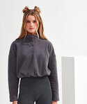 Cropped pull-over fleece with high neck. 1/4 neck popper fastenings to front. Elasticated waistband. We recommend using block out vinyl and inks.Product contains no branded neck or waist label. Removable Kimble or looped garment tags. Inner seam label holds important product information on one label with a second label containing brand information which can be cut-away.